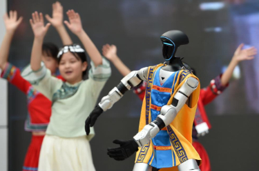 4月13日,在广西南宁市滨湖路小学教育集团滨湖校区,机器人和学生一起表演节目。