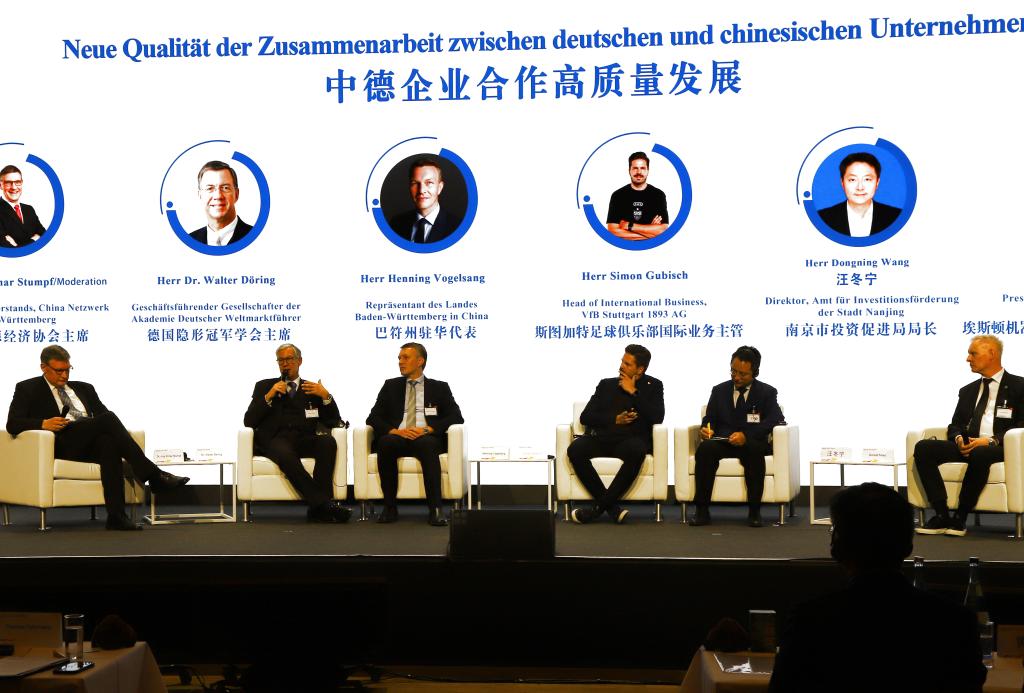 3月2日,在德国斯图加特,与会嘉宾在“南京日”经贸推介活动上展开讨论。