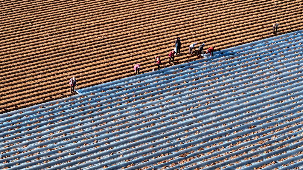 12月6日,在山东省临沂市平邑县临涧镇,农民为蔬菜幼苗覆盖保温薄膜(无人机照片)。大雪节气到来之际,各地农民抢抓农时开展农业生产。新华社发(武纪全摄)