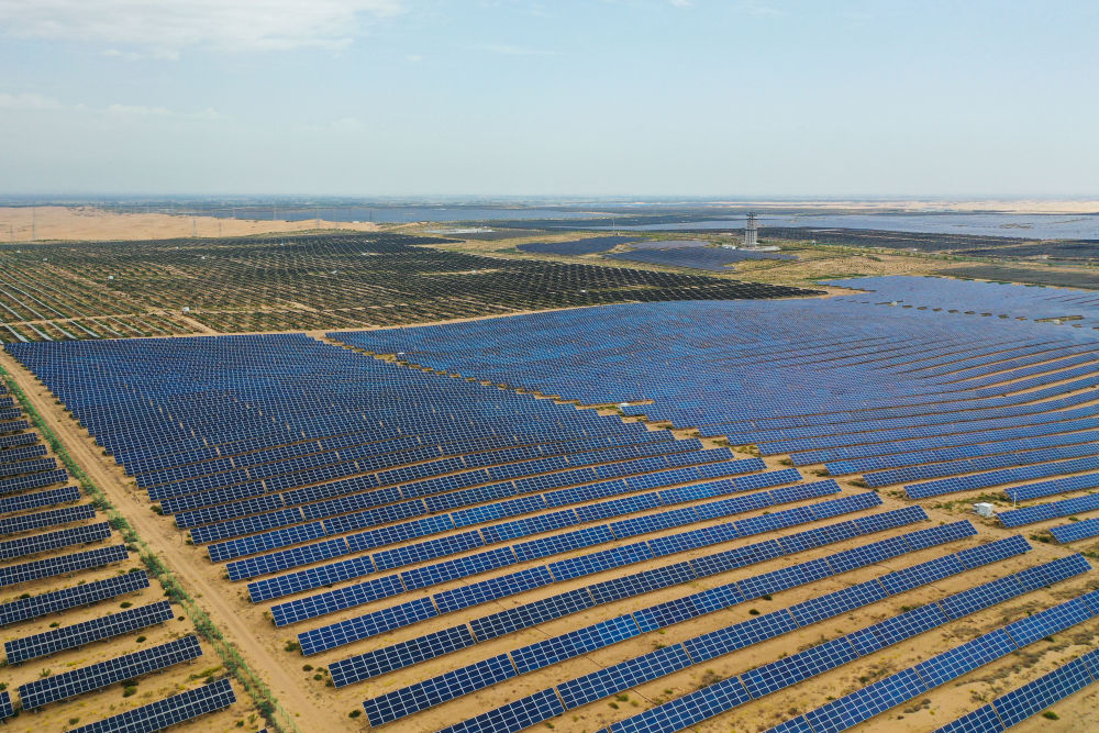 这是2025年9月10日在内蒙古库布其沙漠拍摄的达拉特旗光伏基地。该基地将治沙与新能源产业相融合,在库布其沙漠腹地实现了“板上发电、板下种植、板间养殖”的立体生态循环模式。2025年,一块块蓝色光伏板在北疆构筑起一道一望无际的“光伏长城”,成为生态治理、经济发展的坚实屏障。