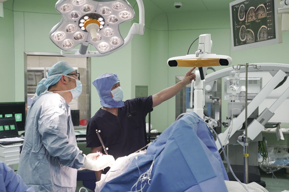 2025年3月25日,路俊锋教授(左)和吴劲松教授在复旦大学附属华山医院手术室给第一例临床试验受试者做手术。2025年3月,中国科学院脑科学与智能技术卓越创新中心联合复旦大学附属华山医院与相关企业,开展侵入式脑机接口的前瞻性临床试验。这标志我国在侵入式脑机接口技术上,成为全球第二个进入临床试验阶段的国家。