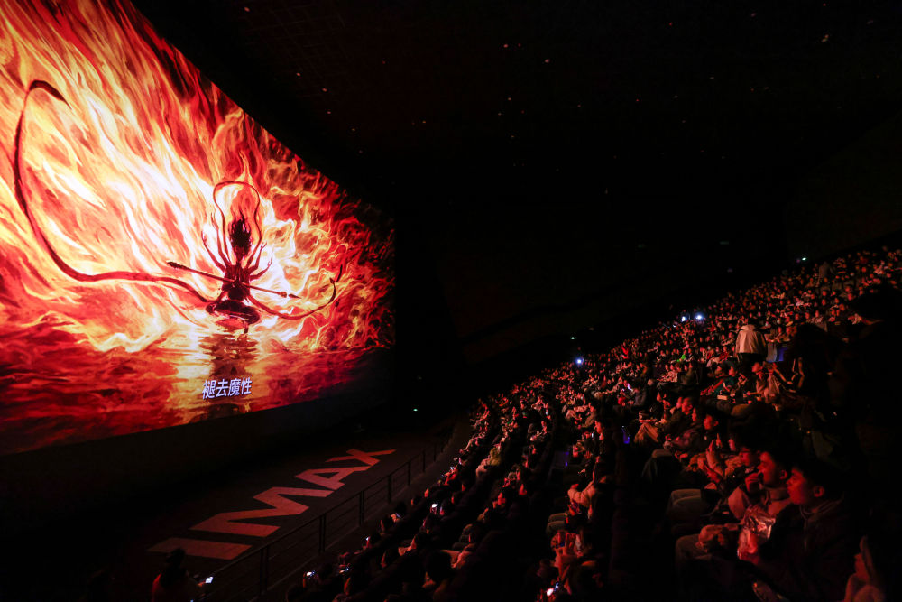 2025年2月25日,观众在贵阳越界影城IMAX影厅内观看电影《哪吒之魔童闹海》。2025年,国家电影局等相继启动“跟着电影品美食”“跟着电影去旅游”“中国电影消费年”等活动,发挥电影对提振消费的积极作用;各地通过发布观影消费券、举办主题活动等形式推动影旅融合,发展票根经济。今年9月发布的《关于扩大服务消费的若干政策措施》提出,进一步支持有条件的地方以优质演艺、动漫、游戏、影视作品等线上流量带动线下场景创新。