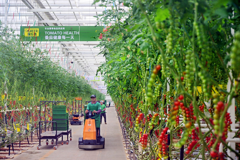 2025年3月4日,员工在山东省莱西市望城街道凯盛浩丰现代设施农业产业园智慧玻璃温室内忙碌。该温室采用国产超白减反无影玻璃,透光率高,可保证射入的自然光线得到充分利用。我国正加快发展农业新质生产力,以科技赋能粮食生产、储存、加工全链条,推动“汗水农业”向“智慧农业”加速迈进。