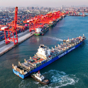 2025年12月5日,在山东港口日照港集装箱码头,满载集装箱的船舶驶离港口(无人机照片)。新华社发(李大伟摄)