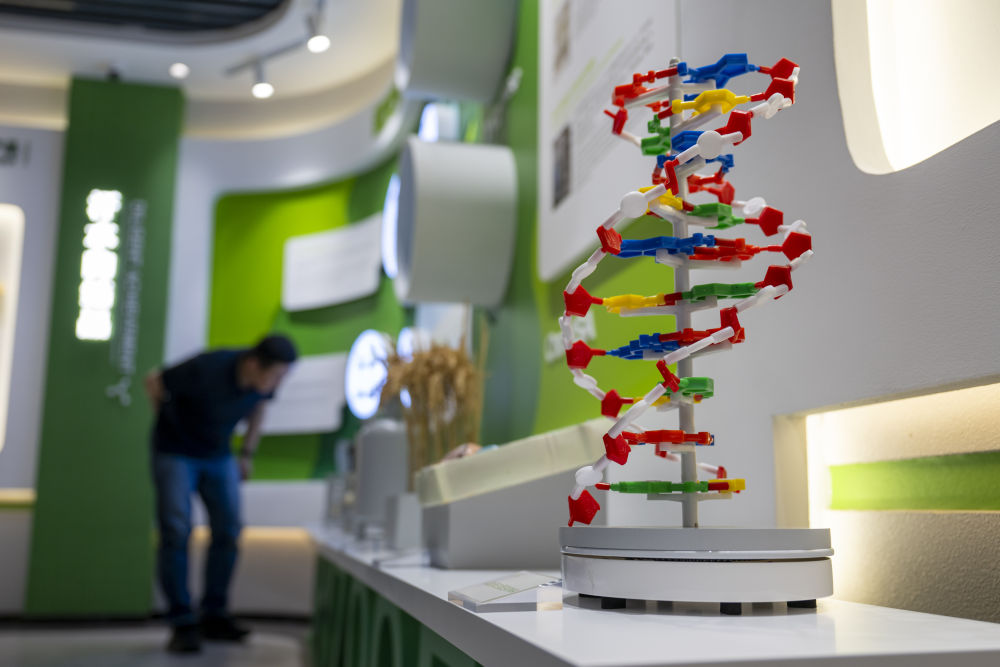 这是2025年4月21日在湖北武汉一家生物科技股份有限公司展厅拍摄的基因工程相关模型。该企业历经多年研发生产的植物源生物药产品,为前沿生物医药产业拓展了新的发展空间。