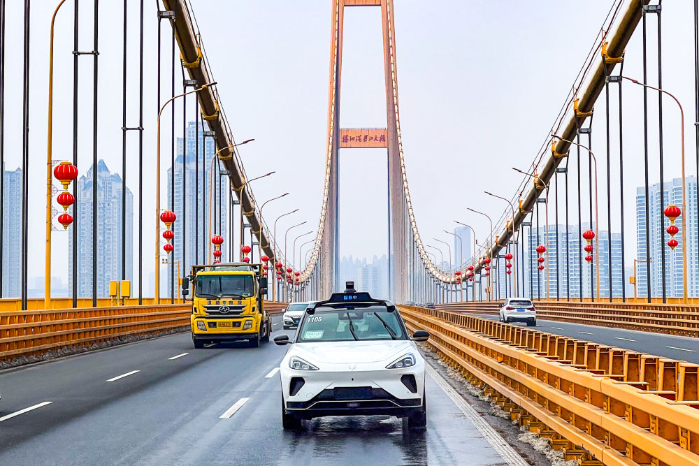 目前,武汉已构建全球最大自动驾驶运营区,覆盖12个行政区,辐射面积约3000平方公里,在服务市民出行的同时,为智能驾驶技术研发升级提供着源源不断的现实数据。这是2024年2月27日,一辆全无人自动驾驶汽车在武汉杨泗港长江大桥桥面上行驶。