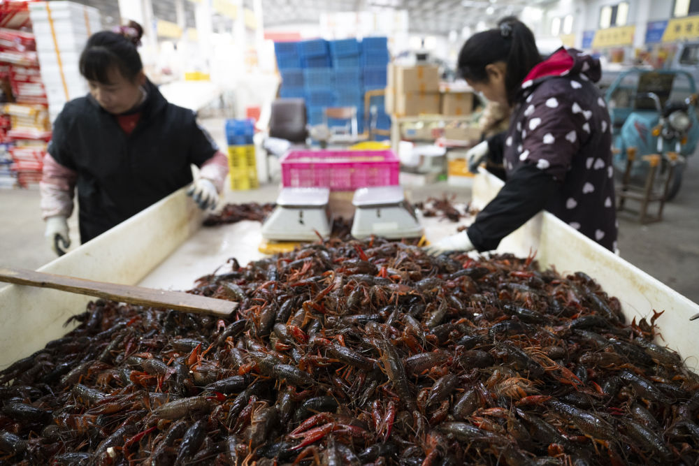 2025年12月25日,工作人员在潜江市小龙虾交易市场分拣小龙虾。近年来,潜江市大力推广冬季养虾技术,通过同田育养分区、营养精准供给、水质调控等关键技术,让小龙虾打破季节性限制,实现四季稳定上市,产品广销全国600多个城市。