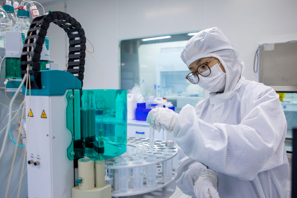 这是2020年4月22日在湖北宜昌一家药品生产企业拍摄的质检工序场景。该企业是国内最大的麻醉药品定点研发企业,研发生产的麻醉药品在国内占据60%以上市场份额。