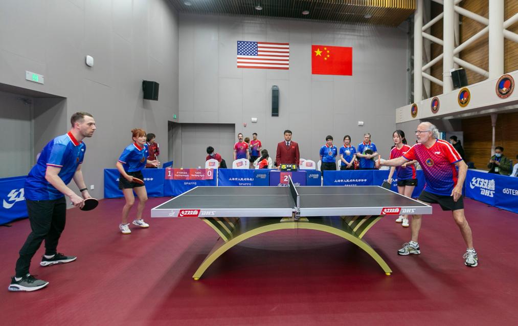 2021年4月10日,上海举行纪念中美“乒乓外交”50周年系列活动。这是中美选手参加乒乓球友谊赛。新华社记者 王翔 摄