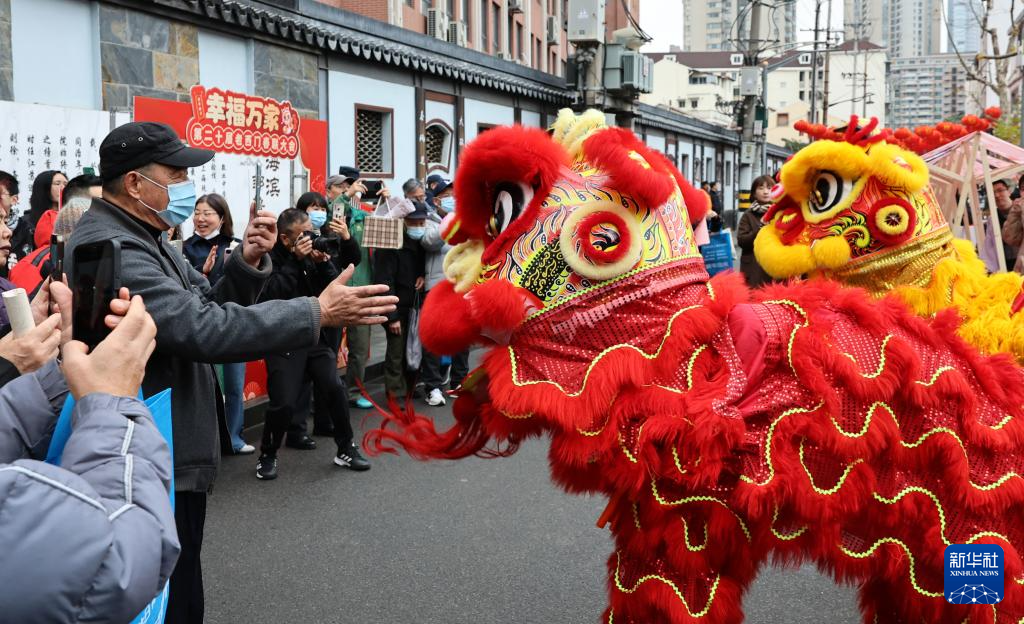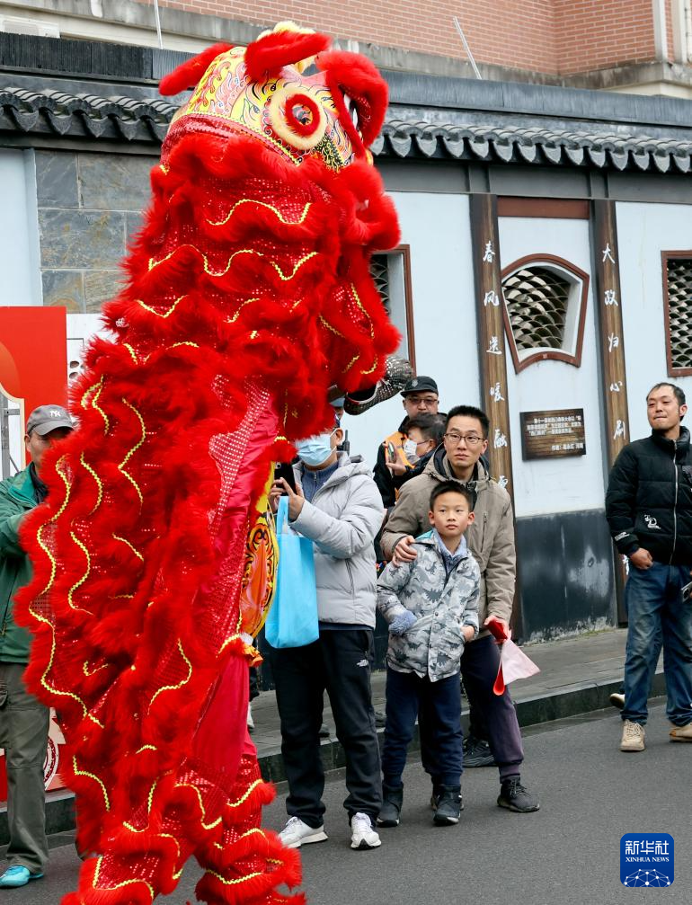 1月23日,传统舞狮表演吸引市民游客拍照互动。