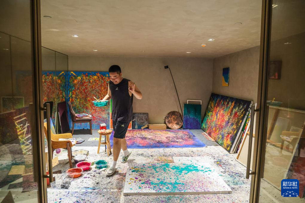 8月8日,王剑书在北京的画室创作滴洒画时,开心得跳起来。
