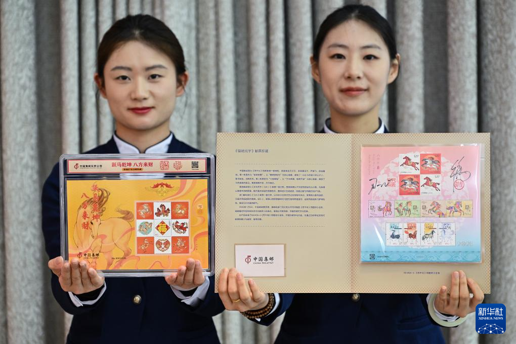 1月29日,工作人员展示活动现场发布的《跃马乾坤 八方来财》雕刻版生肖主题邮票珍藏摆件(左)和《骏驰元宇》邮票珍藏册。