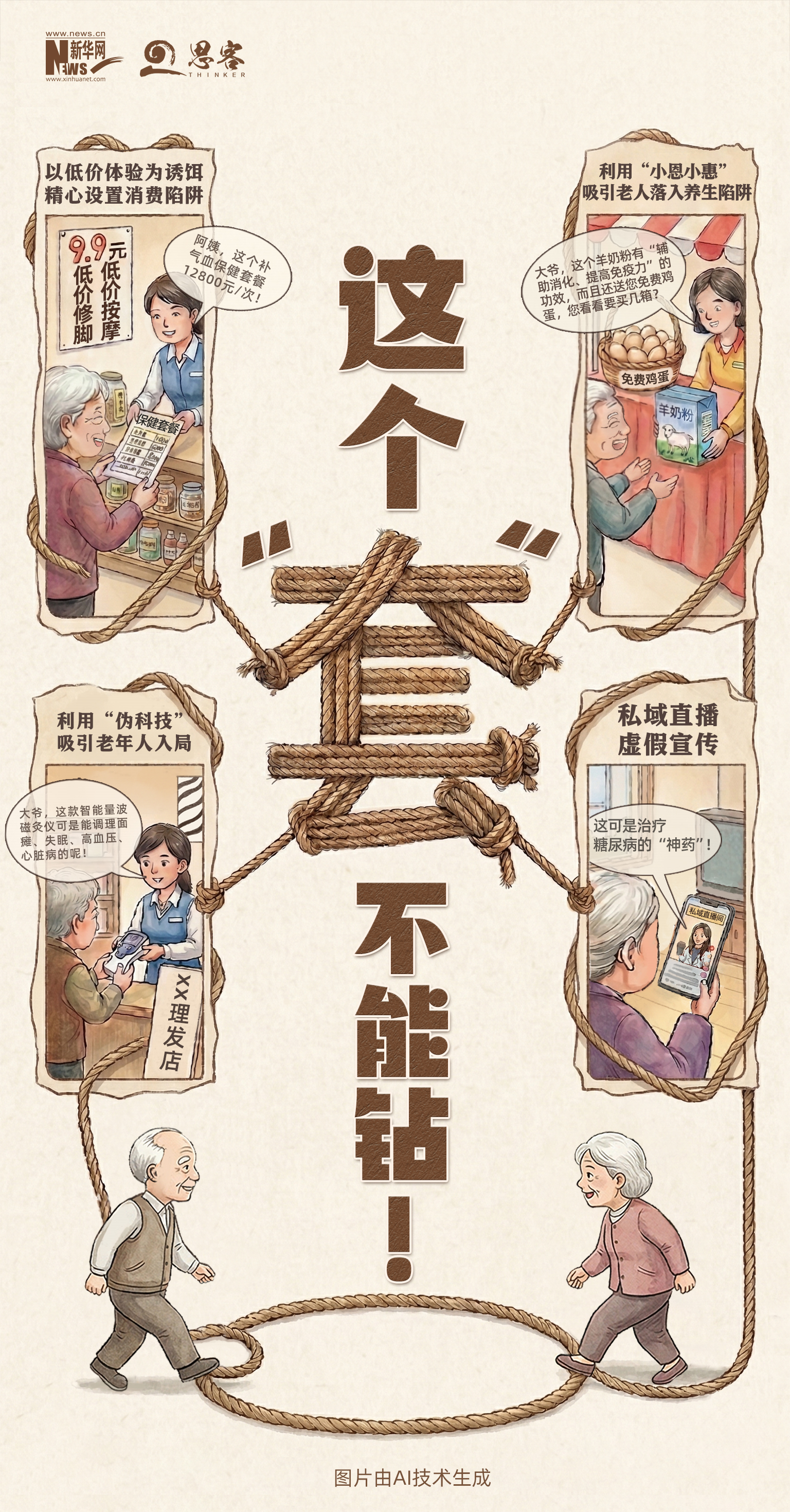 随着老龄化程度日益加深,老年群体的健康需求不断增长,养生保健“坑老”骗局层出不穷、花样翻新。从免费领鸡蛋、听课送红包的小恩小惠,到包治百病的保健神药、天价理疗套餐,一场场看似诱人的养生礼包,背后尽是算计老年人积蓄的圈套。唯有依法严打、露头就打,才能戳破养生陷阱的伪装,守住老年人的“钱袋子”,不让养生成为欺骗老年人的圈套。
