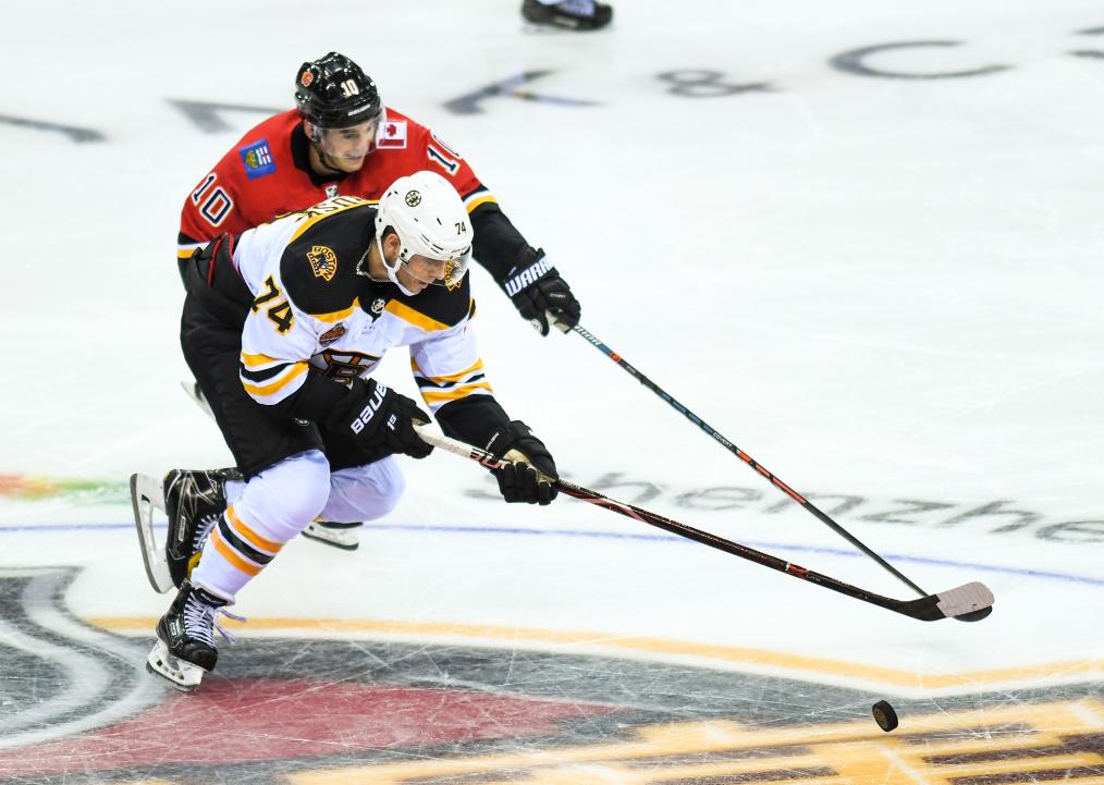 资料图:2018年9月15日,卡尔加里火焰队球员德里克·瑞恩(上)和波士顿棕熊队球员杰克·德布鲁斯科在比赛中拼抢。当日,2018年NHL(北美职业冰球联赛)中国赛在深圳拉开战幕。新华社记者 毛思倩 摄