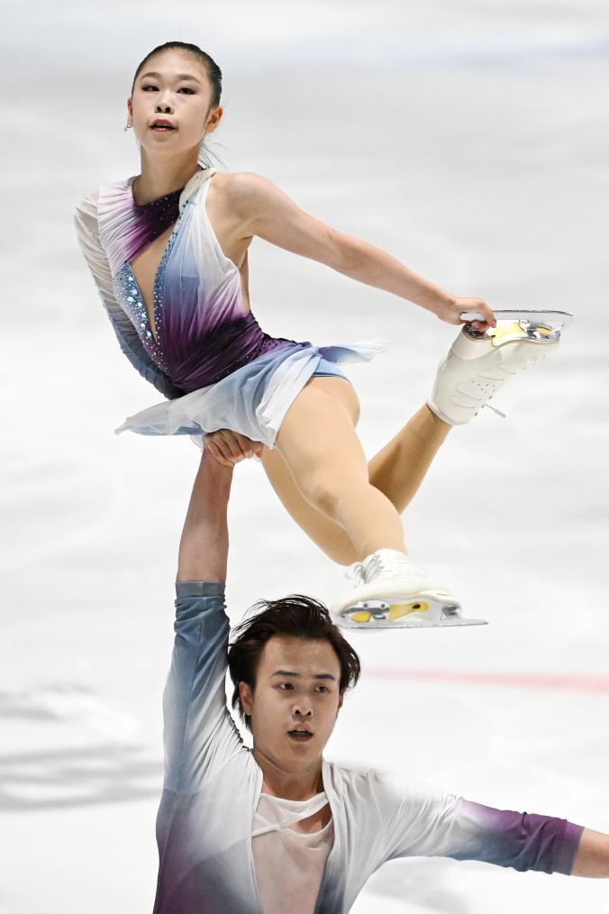 8月13日,张嘉轩/黄一航(下)在双人滑自由滑比赛中,他们获得双人滑第一名。新华社记者 鞠焕宗 摄
