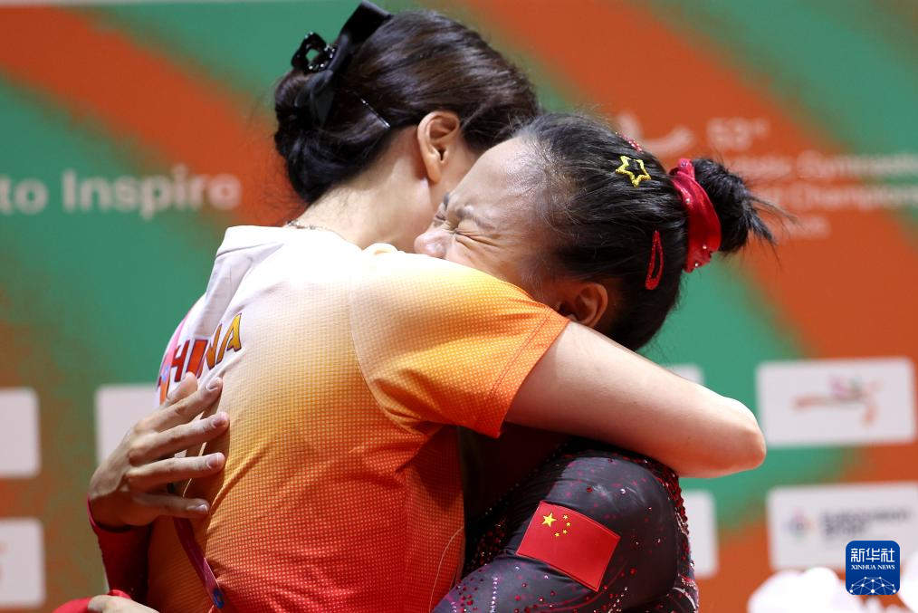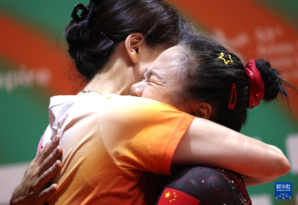 10月25日,张清颖(右)夺冠后和教练徐惊雷拥抱。