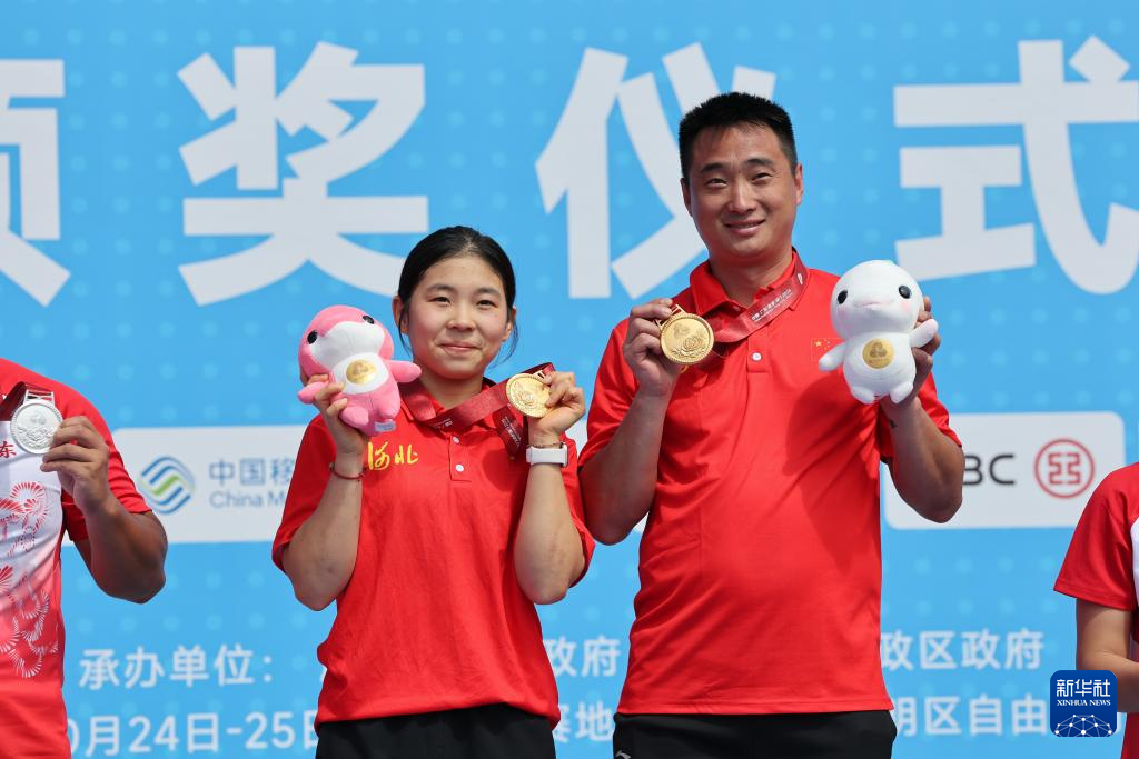 10月25日,冠军河北队选手孙思蓓(左)和教练在颁奖仪式上。