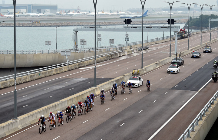2024年11月24日的测试赛上,参赛选手在港珠澳大桥香港段骑行。新华社发(卢炳辉摄)