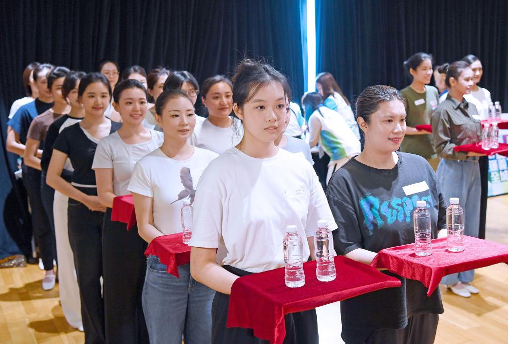 训练间隙,王巩钰轻揉发酸的手臂,托盘在腕上留下浅痕。“强度不算什么。”她笑言,“为保持微笑,我们需用牙齿夹住筷子练习,虽然酸但镜中的自己很美,一切都值得。”