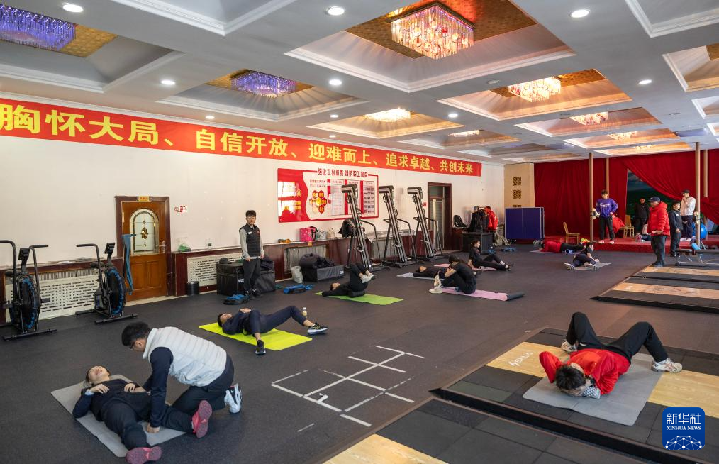11月6日,在食堂改造而成的临时体能训练馆里,自由式滑雪空中技巧国家集训队队员在体能和力量训练开始前拉伸。