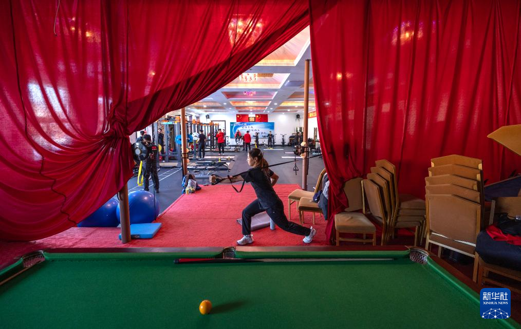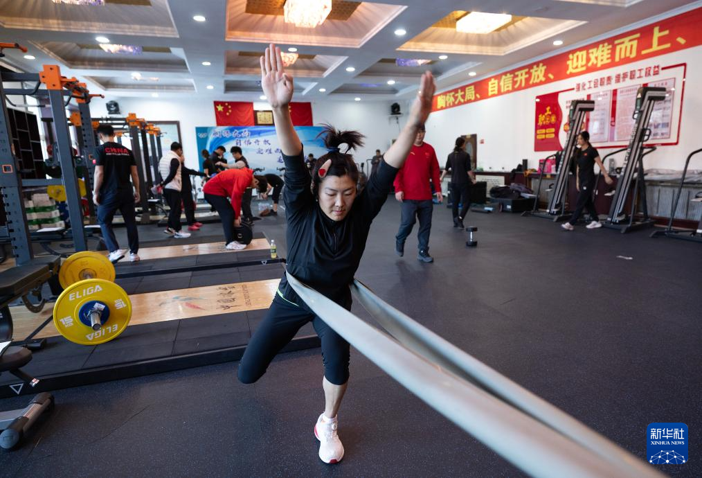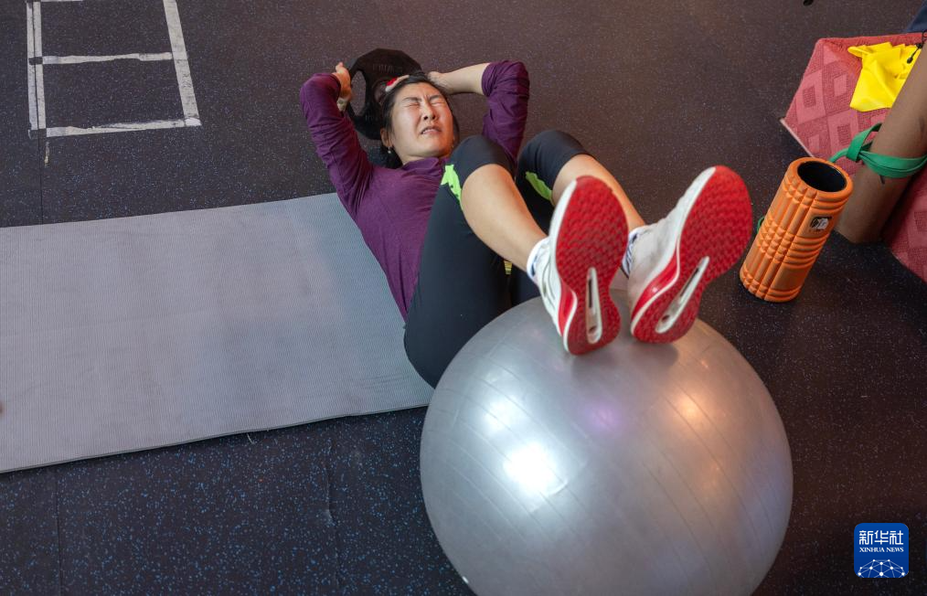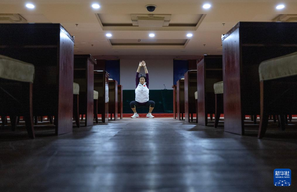 11月6日,在食堂改造而成的临时体能训练馆里,自由式滑雪空中技巧国家集训队队员陈梅婷在进行体能和力量训练。
