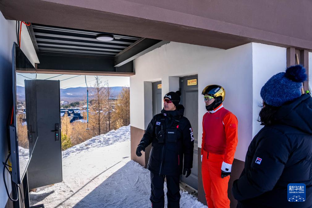 11月7日,自由式滑雪空中技巧国家集训队队员李天马离开雪场的小屋准备试跳。