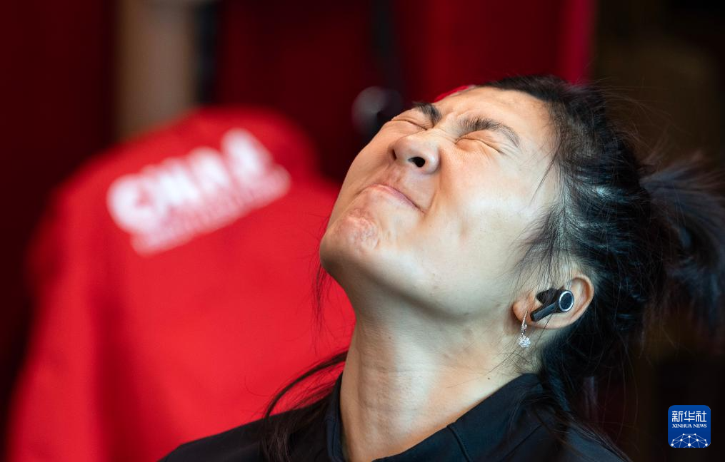 11月6日清晨,在宾馆会议室,自由式滑雪空中技巧国家集训队队员徐梦桃在进行拉伸。