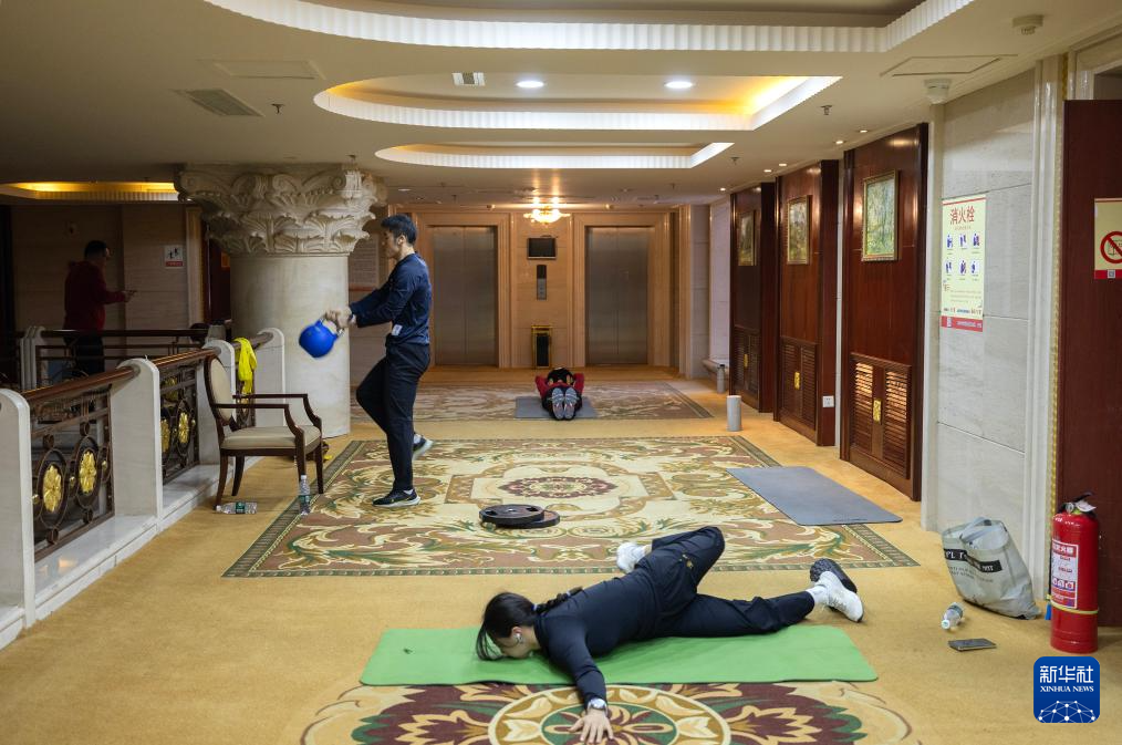 11月7日清晨,在宾馆走廊上,自由式滑雪空中技巧国家集训队队员孙佳旭和队友在进行拉伸。