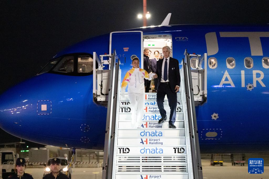 当地时间12月4日下午,搭载2026年米兰-科尔蒂纳冬奥会火种的航班从雅典抵达意大利罗马菲乌米奇诺机场。