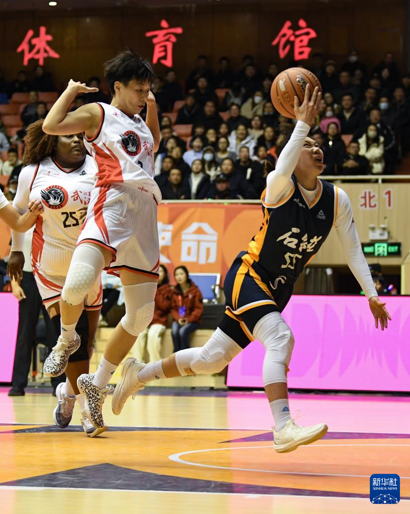 12月7日,石家庄英励队球员彭晓彤(左)在比赛中投篮。