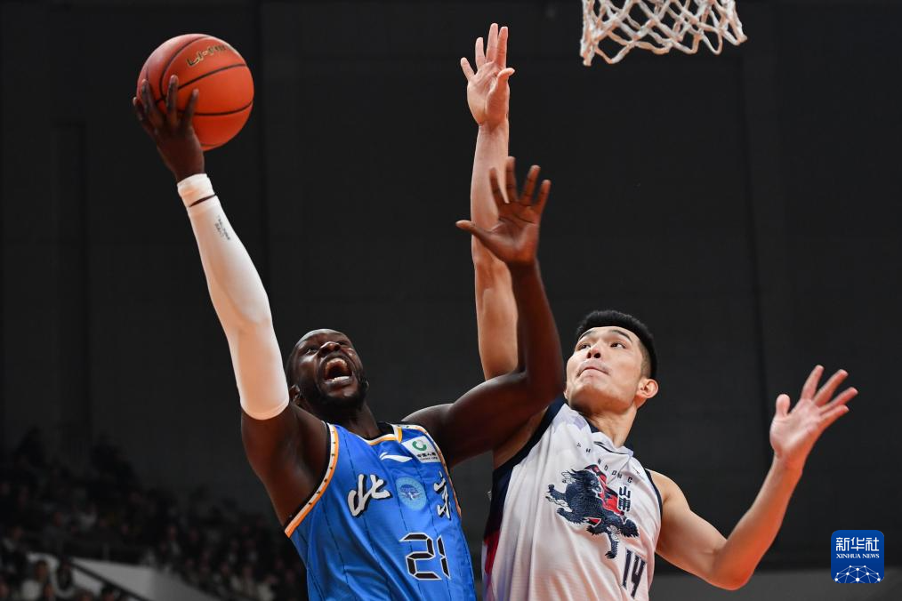 12月7日,山东高速队球员克里斯(左)在北京北汽队球员斯佩尔曼防守下上篮。