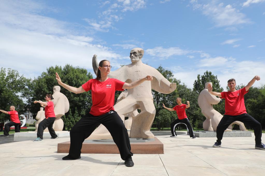 ↑8月16日,拉脱维亚学员在河南焦作市中国太极拳博物馆前练习太极单剑。新华社发(徐宏星摄)