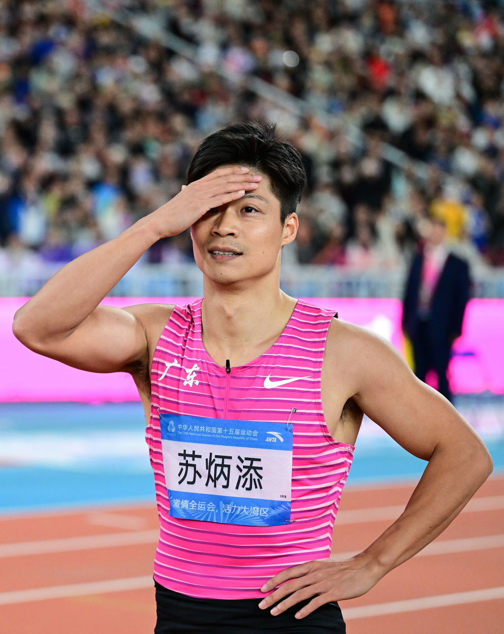 ↑11月20日,广东队选手苏炳添在第十五届全国运动会田径项目男子4X100米接力决赛后。