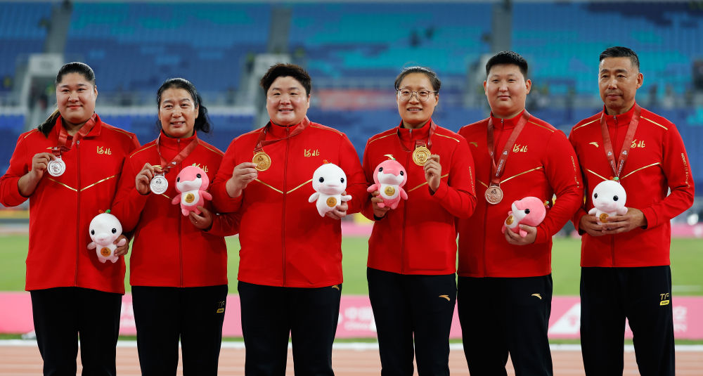 ↑11月16日,冠军河北队选手巩立姣(左三)、亚军河北队选手张林茹(左一)和季军河北队选手马越(右二)以及教练在第十五届全国运动会田径女子铅球颁奖仪式上。