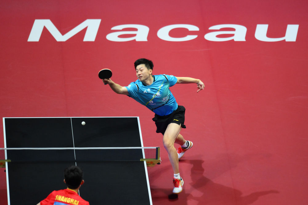 ↑11月20日,北京队选手马龙在第十五届全国运动会乒乓球男子团体金牌赛男单比赛中回球。最终,他3比0战胜上海队选手周恺。