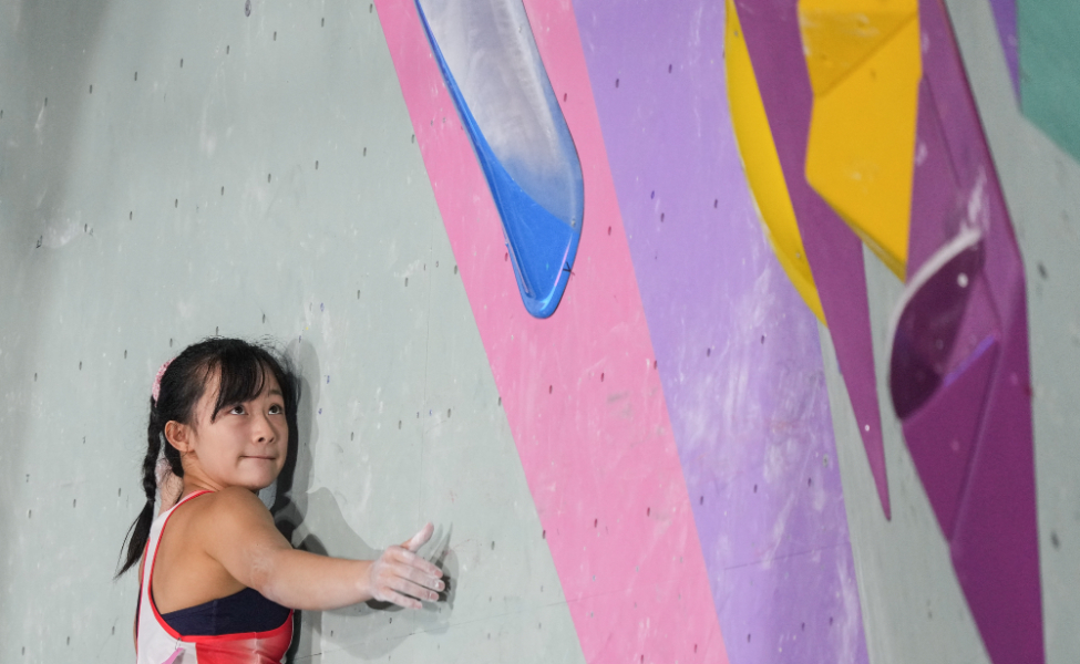 11月15日,广东队选手李美妮在比赛中。她最终夺得冠军。当日,第十五届全国运动会攀岩项目女子攀石决赛在广州举行。新华社记者 晋美多吉 摄