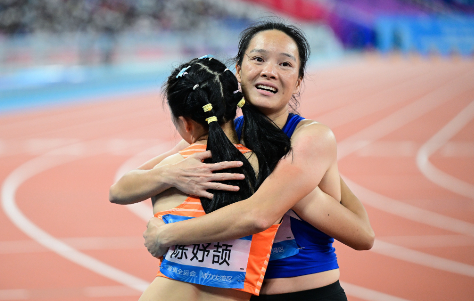 11月17日,浙江队选手陈妤颉(左)和广西队选手韦永丽在赛后拥抱。她们分获冠军和亚军。当日,第十五届全国运动会田径女子100米决赛在广州举行。新华社记者 江汉 摄