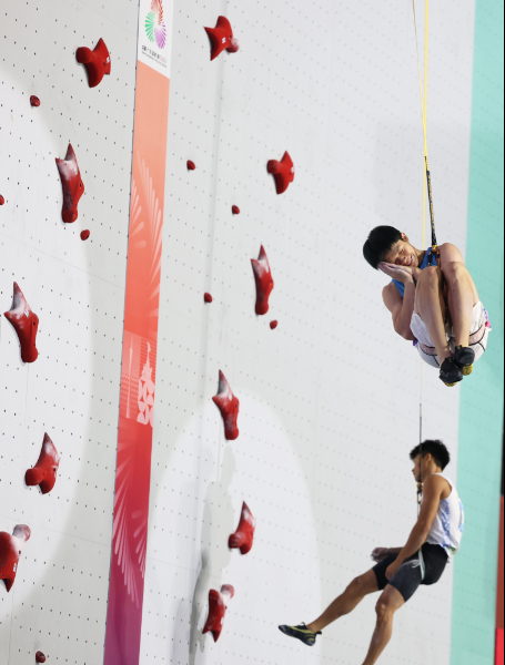 11月14日,上海队选手赵一程(上)和江西队选手黄敬杰在男子速度金牌决赛后。最终,赵一程夺得冠军。当日,第十五届全国运动会攀岩项目男子速度比赛在广州进行。新华社记者 杨世尧 摄
