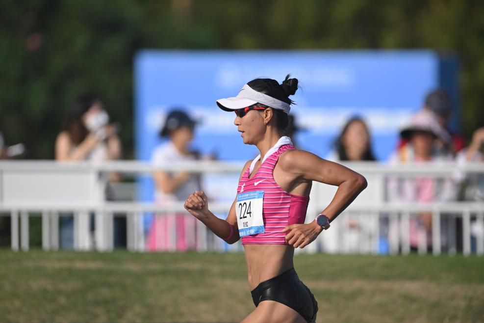11月17日,刘虹在比赛中。当日,第十五届全运会田径项目马拉松竞走混合接力决赛中,刘虹携手队友王凯华获得第四名,无缘奖牌。新华社记者 张龙 摄