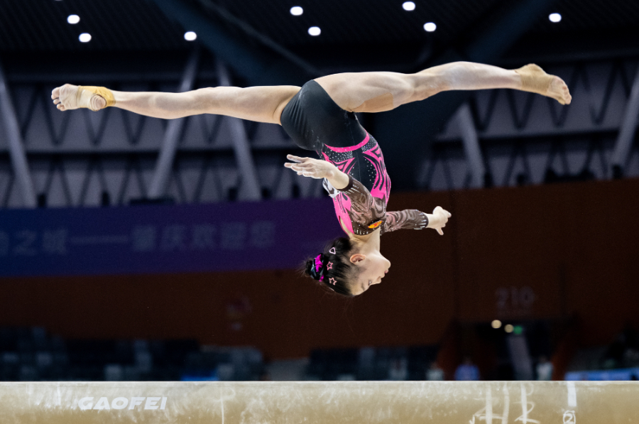 11月17日,广东队选手柯沁沁在比赛中。她夺得冠军。当日,第十五届全国运动会体操项目女子平衡木决赛在肇庆举行。新华社记者 杜子璇 摄