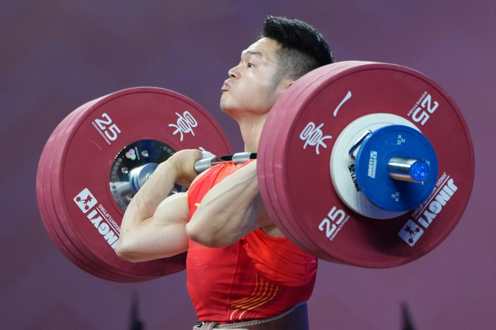 11月17日,石智勇在挺举比赛中。当日,在广东东莞举行的第十五届全国运动会举重男子73公斤级决赛中,浙江队选手石智勇夺冠。 新华社记者 杨晨光 摄