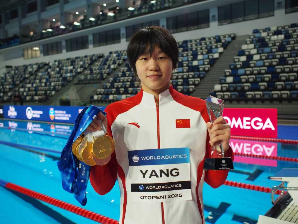 杨佩琪在赛后展示奖牌和MVP奖杯。中国游泳队供图