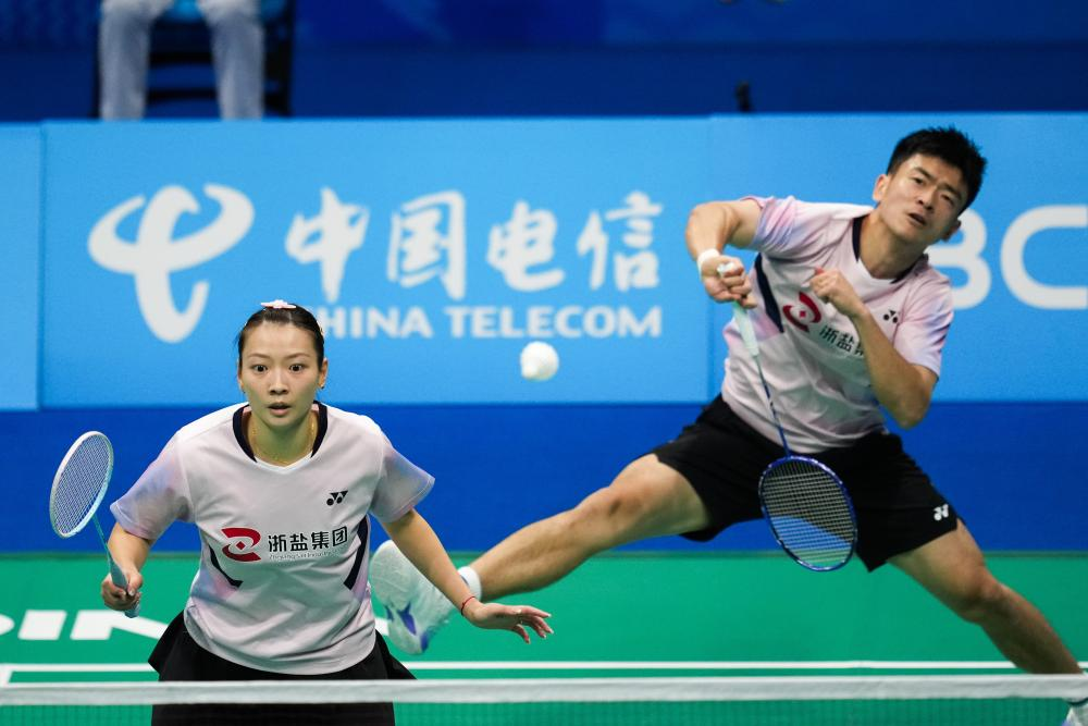 11月20日,浙江队组合郑思维(右)/黄雅琼在比赛中。当日,在广东深圳举行的第十五届全国运动会羽毛球混合双打决赛中,浙江队组合郑思维/黄雅琼获得冠军。新华社记者 陈思汗 摄