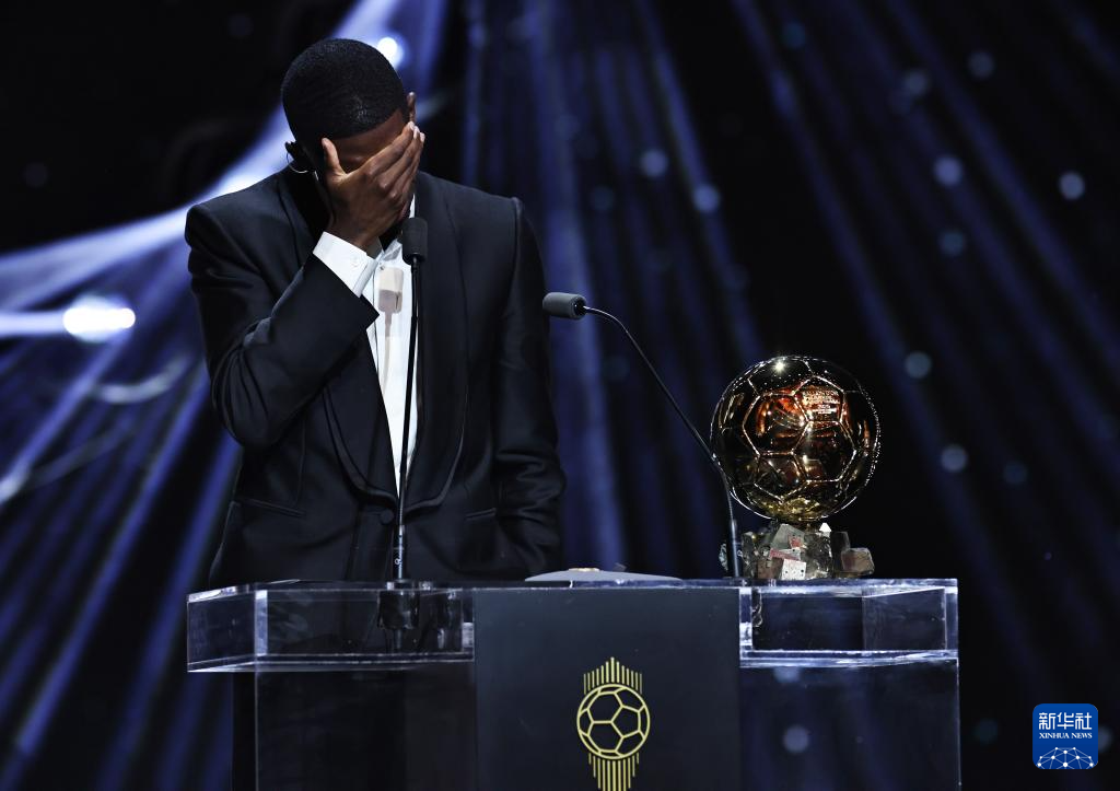 2025年9月22日,巴黎圣日耳曼队法国球员登贝莱在颁奖仪式上。他获颁男足金球奖。