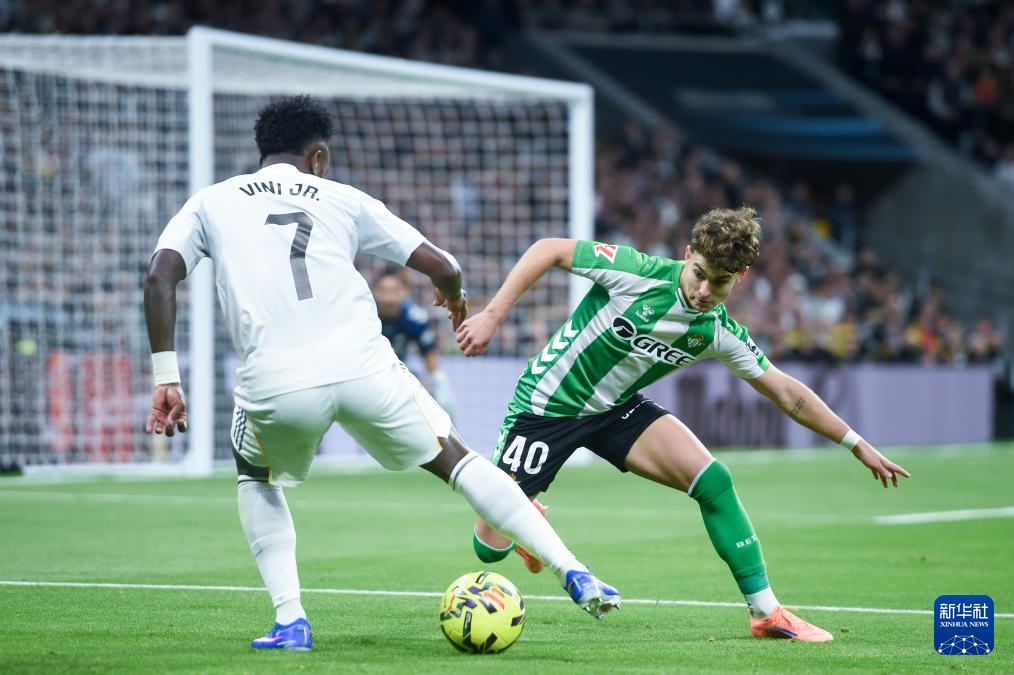 1月4日,皇家马德里队球员维尼修斯(左)和皇家贝蒂斯队球员安赫尔·奥尔帝斯拼抢。