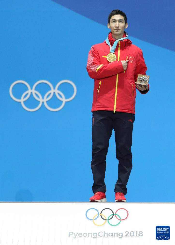 图为2018年2月23日,冠军中国选手武大靖在平昌冬奥会短道速滑男子500米奖牌颁发仪式上。