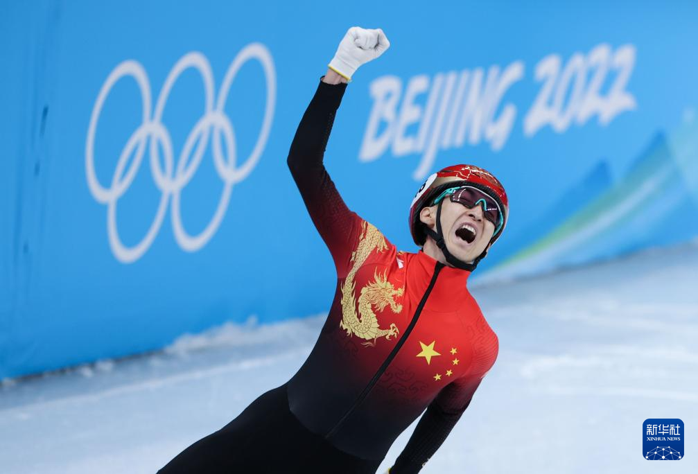 图为2022年2月5日,在北京2022年冬奥会短道速滑项目混合团体接力决赛后,中国队选手武大靖庆祝中国队夺冠。