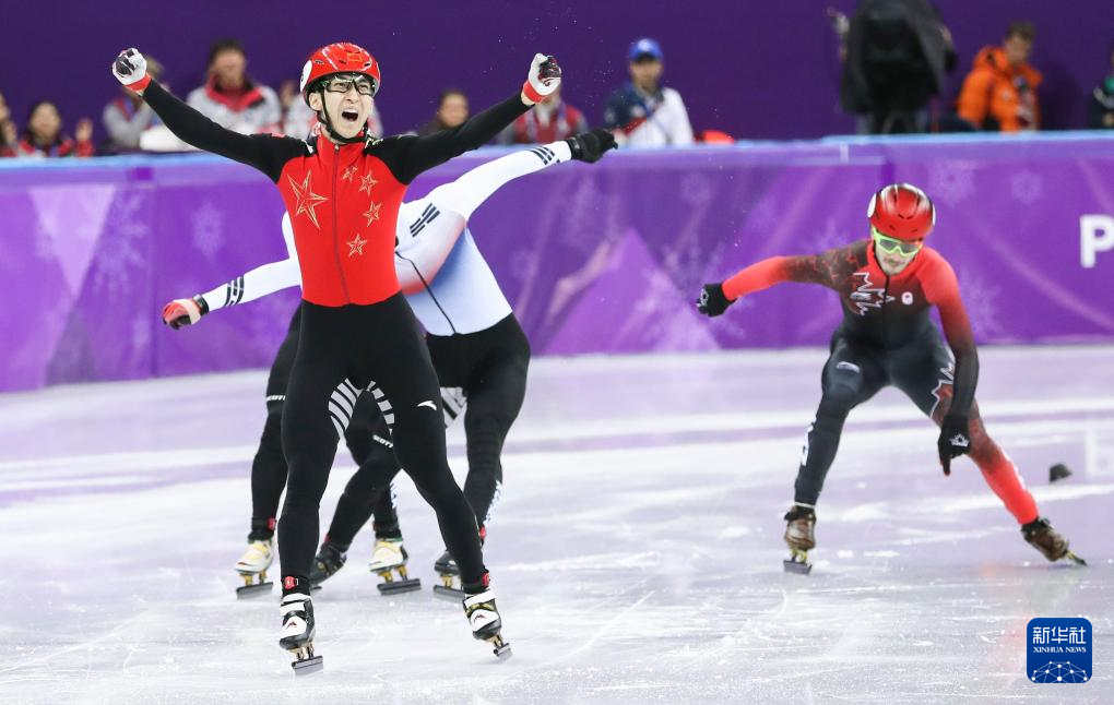 图为2018年2月22日,在2018年平昌冬奥会短道速滑男子500米决赛中,中国选手武大靖庆祝夺冠。