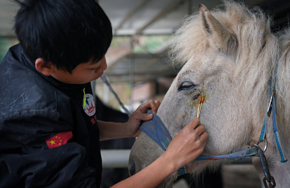 吴天昊在给马擦拭伤口。新华社记者 万象 摄