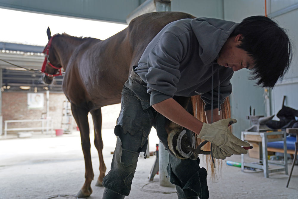 马术班高二学生邹国成在给马钉掌。新华社记者 万象 摄